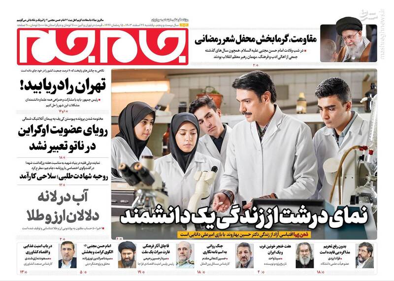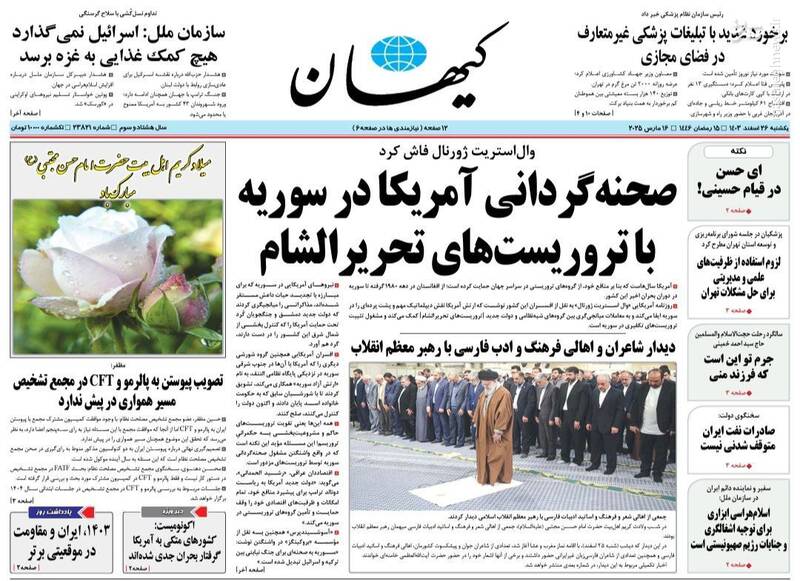 خوب و بد بازار شب عید، صحنهگردانی آمریکا در سوریه با تروریستهای تحریرالشام، معجزه بارورسازی ابرها در خراسان جنوبی، از جمله تیتر روزنامههای یکشنبه ۲۶ اسفند ۱۴۰۳ هستند. عکس/ صفحه نخست روزنامههای یکشنبه ۲۶ اسفند ۱۴۰۳ منبع: مشرق ? عکس/ صفحه نخست روزنامههای یکشنبه ۲۶ اسفند ۱۴۰۳
