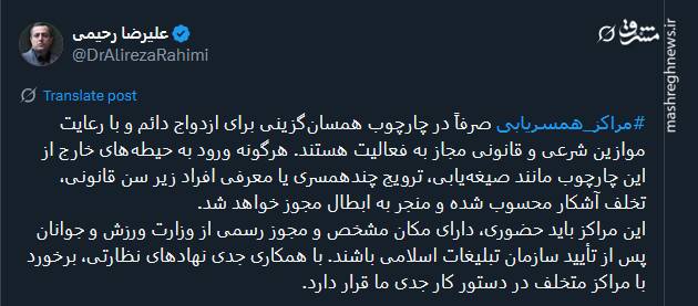 منبع: مشرق ? هشدار به مراکز همسریابی؛ ورود به حیطههایی مانند صیغهیابی و ترویج چندهمسری سبب ابطال مجوز می شود/ صیغهیابی و چندهمسری در مراکز همسریابی ممنوع است