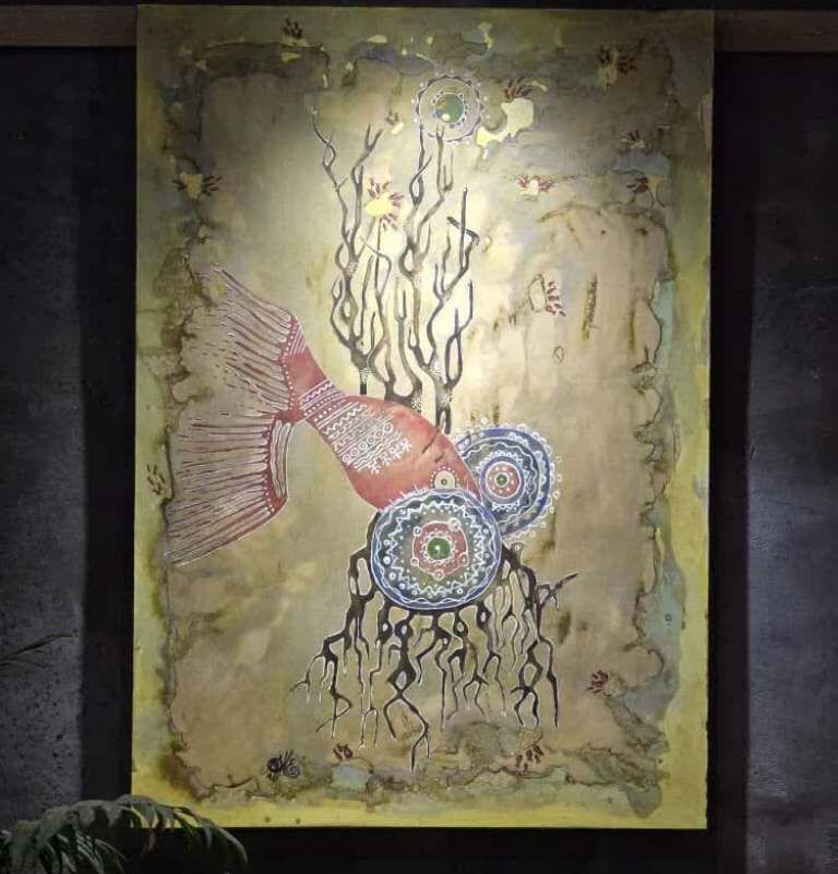 پس از آشنایی اولیه و گپ و گفتی کوتاه، ۲ تابلو از کارهایش را نشانم داد، برای منِ خبرنگار که علاقه به حوزه های مختلف هنری دارم و تا اندازه ای حداقل هنر نقاشی را دنبال می کنم، سبک کارش جدید بود و آنچه به چشم آمد در برخی کارها، بیشتر کاربرد ماهی و نقش های درون پته(صنایع دستی کرمان) بود که به محصول نهایی وی جان می داد و به نوعی تقریبا امضای پای نقاشی های این هنرمند محسوب می شود.