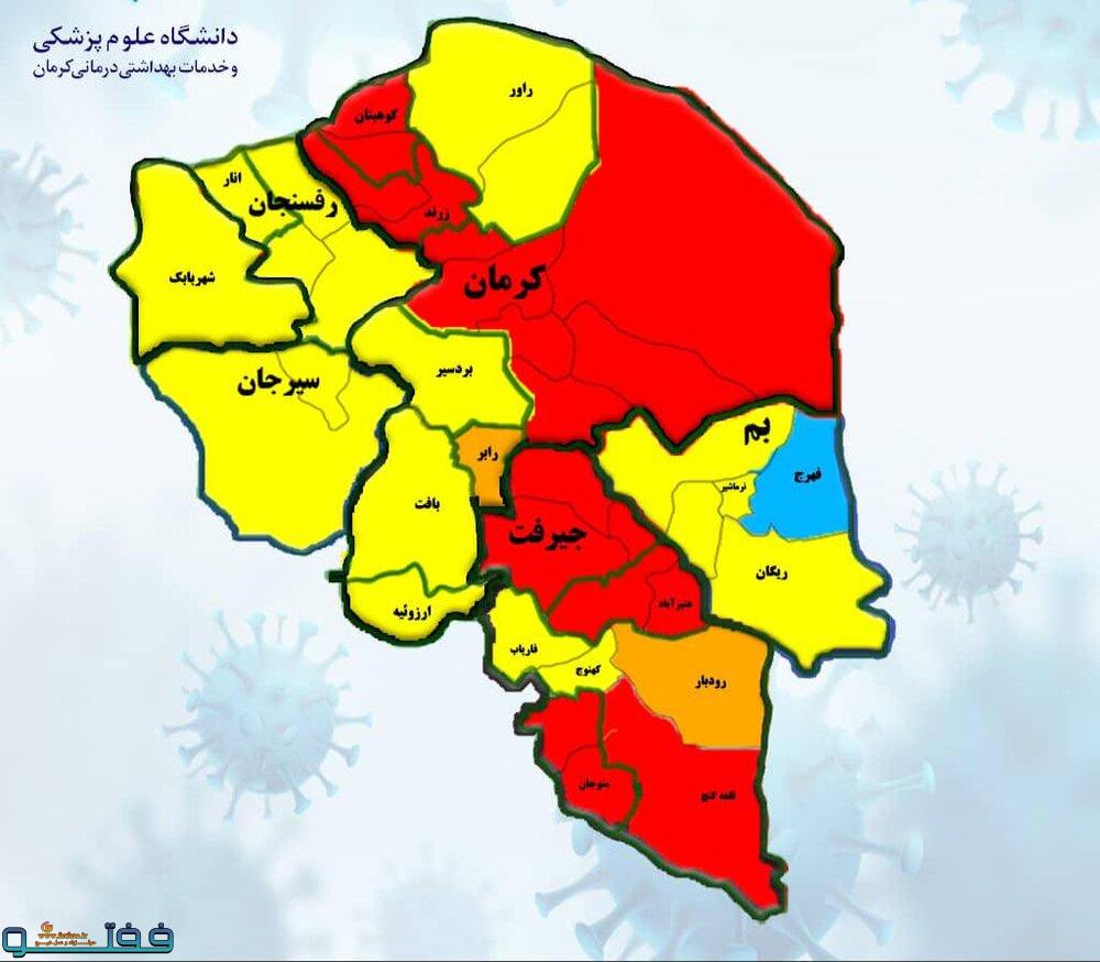 براساس این گزارش در هفته گذشته فقط شهرستان های جیرفت و منوجان در وضعیت قرمز قرار داشتند اما براساس نقشه جدید کرونایی کشور در هفته جاری (۲۵ تیرماه) شهرستان های کوهبنان، زرند، عنبرآباد، کرمان و قلعه گنج نیز به آنها پیوسته و قرمز شده اند ضمن آنکه شهرستان رابر وضعیت نارنجی هفته قبل خود را همچنان حفظ کرده است و شهرستان رودبار جنوب که در هفته قبل در وضعیت زرد کرونایی قرار داشت نیز به نارنجی تغییر رنگ داده است.