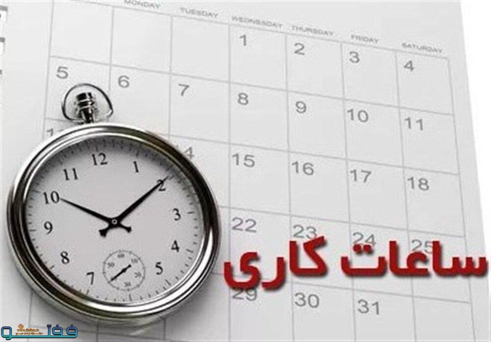 بر این اساس، ساعت کار دستگاههای اجرایی استان کرمان از ۸ صبح تا ۱۴ و ۴۵ دقیقه و ساعت پایان کار روزهای پنجشنبه ۱۳ و ۴۵ دقیقه تعیین شد.