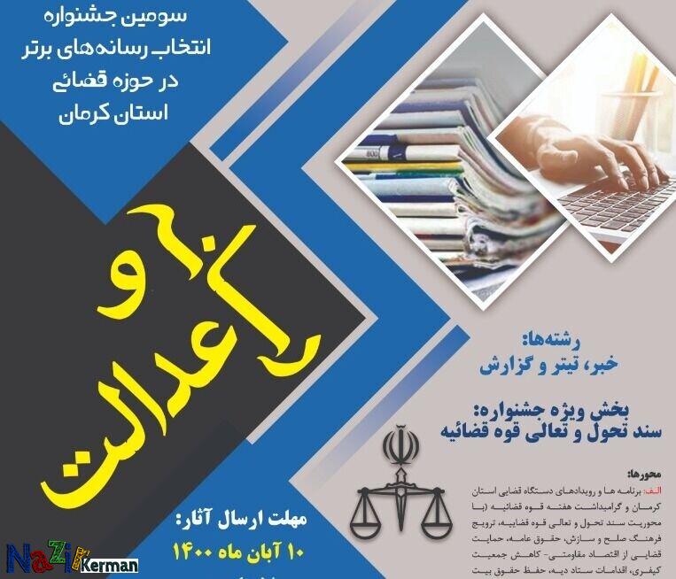 به گزارش نذیر کرمان، دادگستری استان کرمان با ابتکار اولین جشنواره رسانه و عدالت در سال ۱۳۹۶ برگزار کرد که اکنون در برخی از استانهای دیگر نیز این جشنواره برگزار میشود.