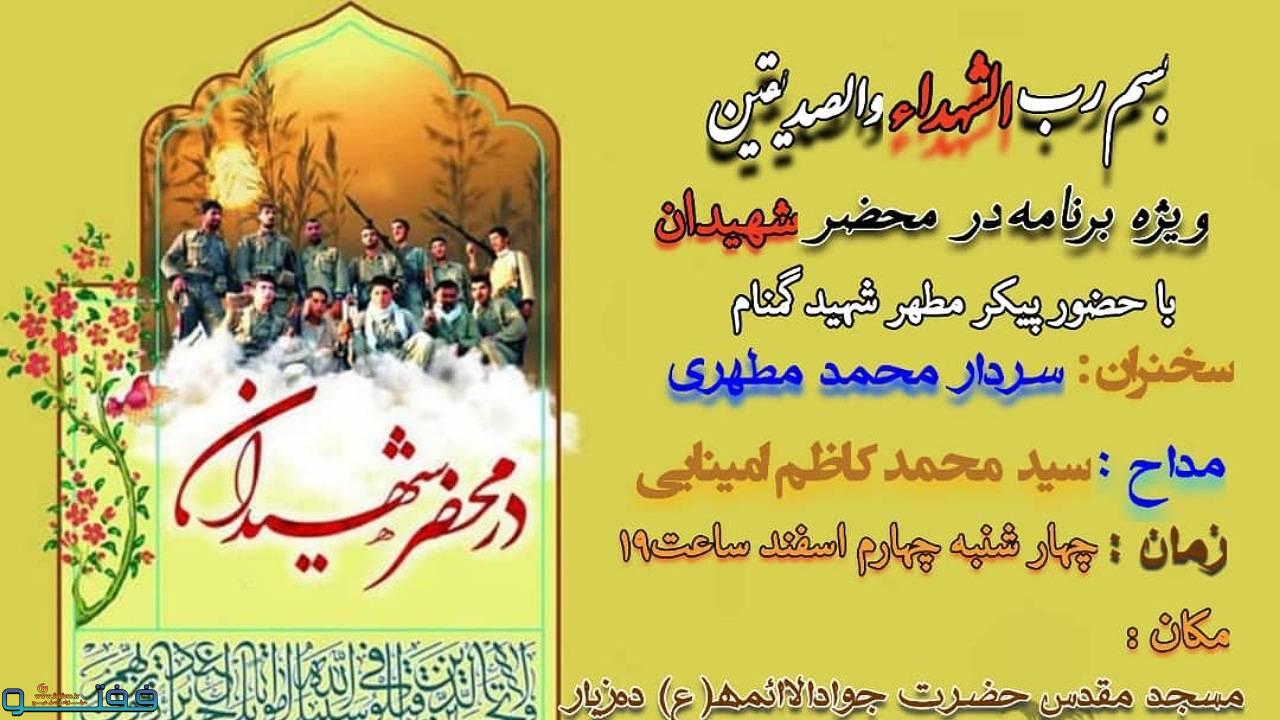 مسئول هیئت تعزیه خوانی حضرت ابوالفضل(ع) روستای ده زیار گفت: این مراسم با سخنرانی سردار نعمتی فرمانده تیپ سوم رزهی ذوالفقار و مداحی مداحی اهل بیت (علیهم السلام) سید محمدکاظم امینایی انجام می شود و روایتگری دفاع مقدس و اجرای گروه سرود از دیگر برنامه های ویژه برنامه در محضر شهیدان در مسجد مقدس حضرت جوادالائمه (ع) است.