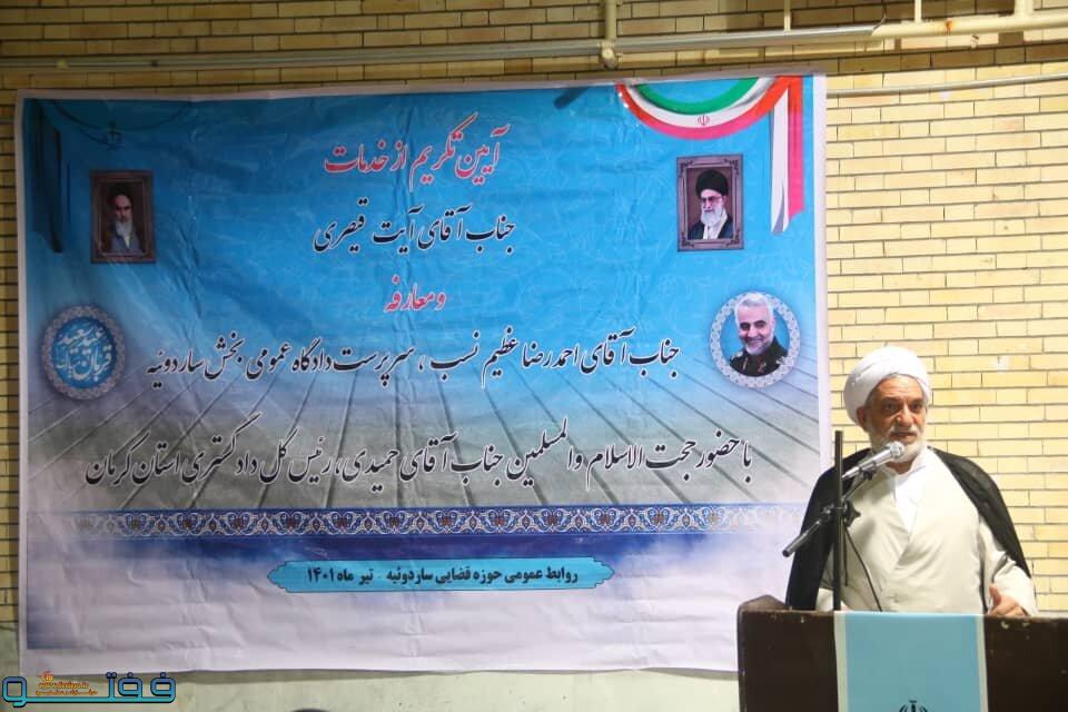 رییس سابق دادگاه عمومی بخش ساردوئیه نیز در این آئین گفت: افتخار داشته ام که به مدت شش سال با صداقت و سلامت خادم این مردم نجیب باشم.