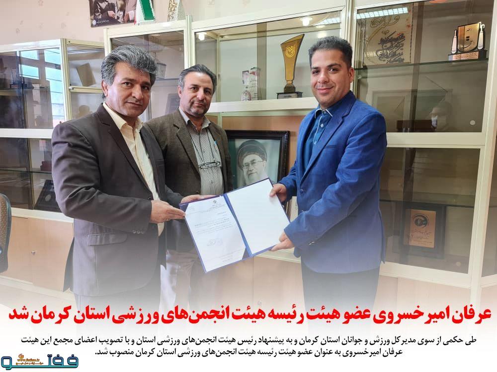 طی حکمی از سوی مدیرکل ورزش و جوانان استان کرمان و به پیشنهاد رئیس هیئت انجمنهای ورزشی استان و با تصویب اعضای مجمع این هیئت عرفان امیرخسروی به عنوان عضو هیئت رئیسه هیئت انجمنهای ورزشی استان کرمان منصوب شد.