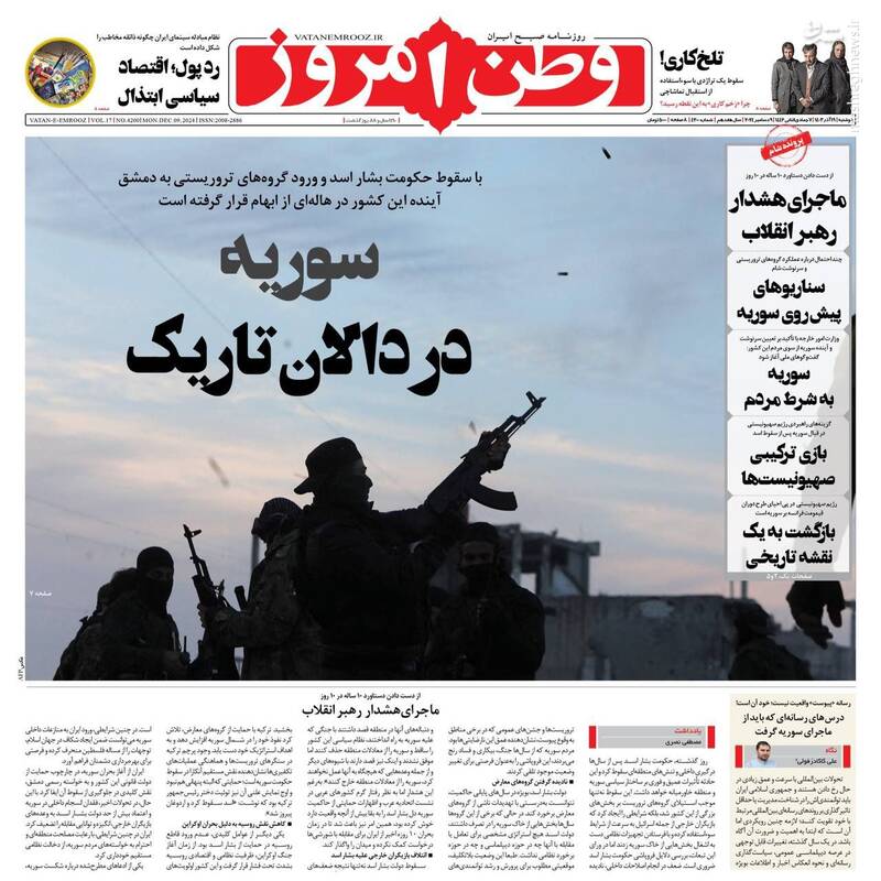 سقوط دمشق، پایان مأموریت تروریستها آغاز سلطه آمریکا، جعبه پاندورا در سوریه باز شد، دالان تاریک سوریه، سناریوهای پسااسد، تیتر برخی از روزنامههای دوشنبه ۱۹ آذر ۱۴۰۳ است.