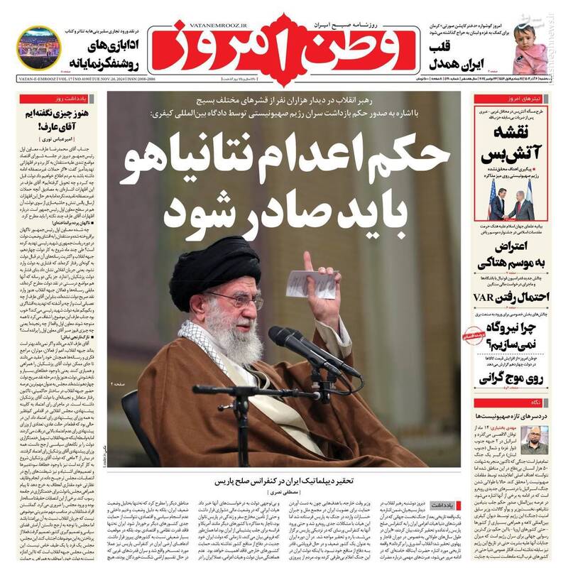 حکم بازداشت کافی نیست نتانیاهو باید اعدام شود، صدای مقاومت تا پیروزی، گسترش جبهه مقاومت چند برابر خواهد شد، هوش مصنوعی شغل ما را میدزدد؟، تیتر برخی از روزنامههای سهشنبه ۶ آذر ۱۴۰۳ است.