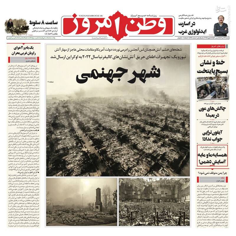کالیفرنیا در محاصره آتش و دود آمریکا؛ ۱۵۰ میلیارد دلار خسارت دید، پای دولت روی گاز تعطیلات، بهترین گزینه در شرایط موجود، تیتر برخی از روزنامههای شنبه ۲۲ دی ماه ۱۴۰۳ است. عکس/ صفحه نخست روزنامههای شنبه ۲۳ دی ۱۴۰۳ منبع: مشرق ? عکس/ صفحه نخست روزنامههای شنبه ۲۳ دی ۱۴۰۳