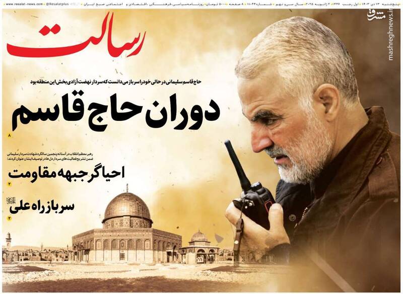 دوران حاج قاسم، اشغالگران سوریه و پایگاههای آمریکا زیر پای جوانان سوری لگدمال خواهد شد، کریسمس خونین امریکاییها در حمله مشکوک به تروریسم، تیتر برخی از روزنامههای پنجشنبه ۱۳ دی ماه ۱۴۰۳ است.