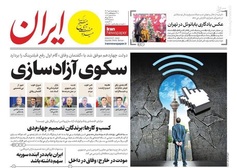 رفع مسدودی از واتساپ و گوگلپلی، انفجارهای پیدرپی شبانه اسرائیل را تکان داد، حالا نوبت حکمرانی بر فضای مجازی است، تیتر برخی از روزنامههای چهارشنبه پنجم دی ۱۴۰۳ است. عکس/ صفحه نخست روزنامههای چهارشنبه ۵ دی ۱۴۰۳ منبع: مشرق ? عکس/ صفحه نخست روزنامههای چهارشنبه ۵ دی ۱۴۰۳