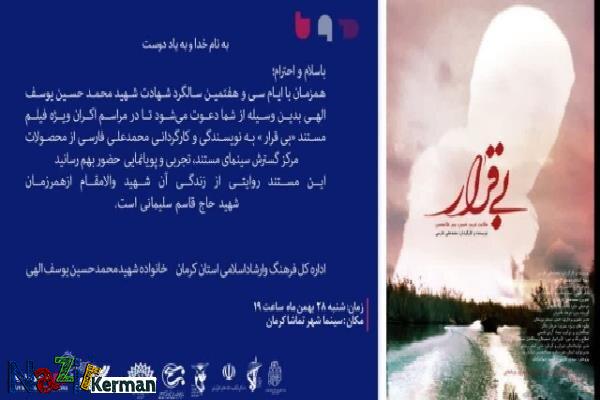نذیر کرمان/کرمان همزمان با سیوهفتمین سالگرد شهادت شهید محمدحسین یوسفالهی مستند فیلم «بیقرار»، روایتی از زندگی این شهید والا مقام در سینما شهرتماشای کرمان اکران میشود.