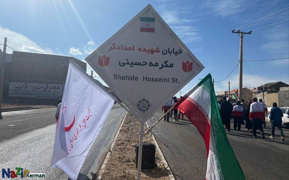 نذیر کرمان/کرمان امروز،۱۰ بهمن ماه با حضور رئیس جمعیت هلال احمر کشور، مدیرعامل جمعیت هلال احمر استان کرمان و مسئولان شهری، یک خیابان در شهر جوپار به نام شهیده امدادگر «مکرمه حسینی» نامگذاری شد.