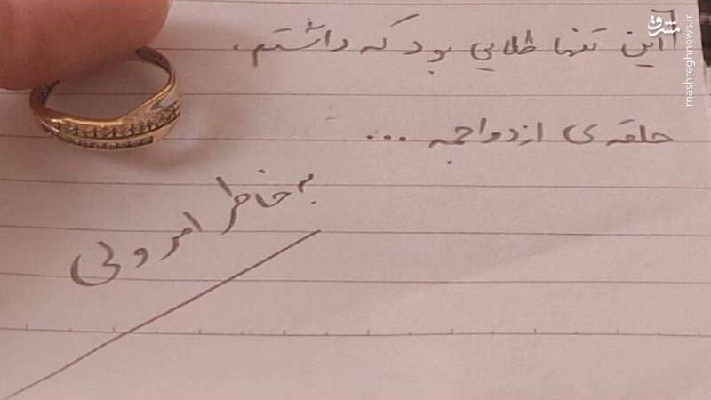 نوشته بود “رد حلقه همسرم روی انگشتش هست چون سیزده سال تمام تو انگشتش جا خوش کرده بود و حالا در معرکه این جنگ تمام قد حق و باطل، تصمیم گرفتیم با هم، عزیزترین دارایی مون رو هدیه کنیم به این جبهه…”
